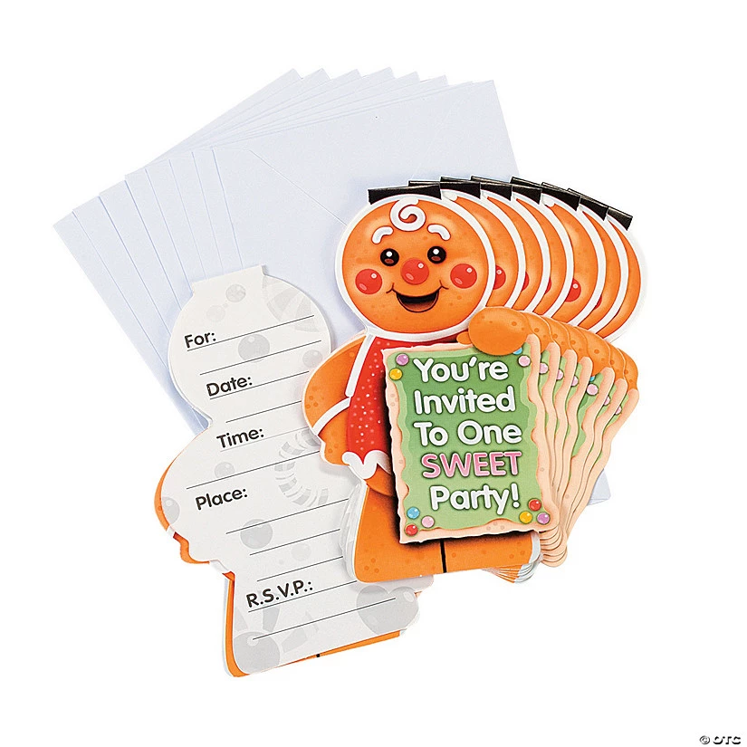 Candytown Invitations. Who could resist this sweet invitation? Picturing a gingerbread boy holding this message: “You’re Invited To One Sweet Party!”, these cards are a deliciously fun! Use these to invite your friends and family to holiday gatherings, cookie exchange parties and more! Includes 8 cards with envelopes.