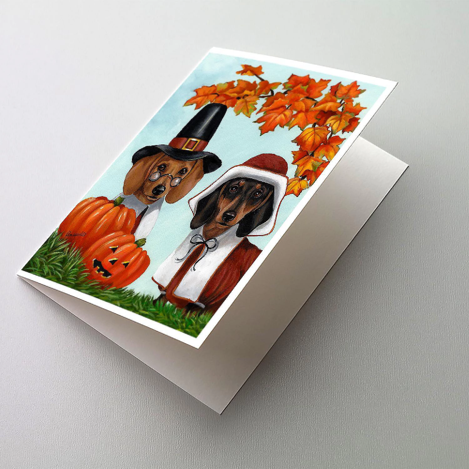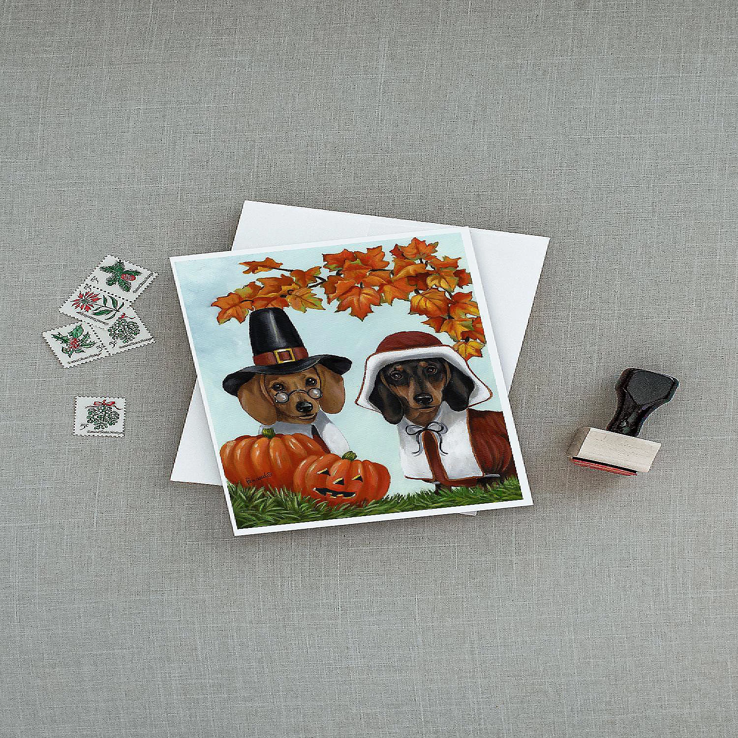 Dachshund Thanksgiving Pilgrims Greeting Cards and Envelopes Pack of 8. Greeting Cards and Envelopes Pack of 8 featuring breed specific Dachshund artwork. Celebrate Thanksgiving with this Thanksgiving . Caroline’s Treasures Printed Greeting card Pack. This is a pack of eight folded 5×7 cards and eight matching white envelopes. These cards are blank inside for you to add your special note or special holiday greeting. The full color artwork cards are printed in our facility in full color on our 80 lb cover stock or 216 GSM. The super smooth finish of the white cards really enhance the artwork on the card. Each card comes with a matching white envelope. The artwork on the card was created by one of our in house creative artist or one of our licensed artists. This is from Caroline’s Treasures Dogs category of products.