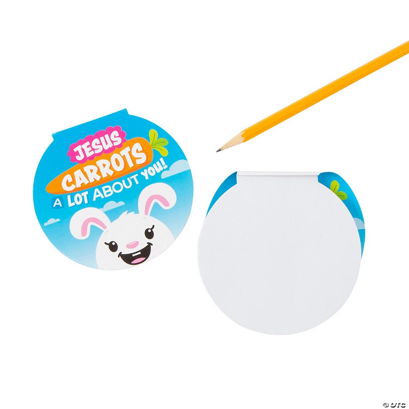 These adorable Easter notepads have a silly yet faith-filled message for kids: Jesus “carrots” about you a lot! The perfect Sunday School prize or reward during Easter, kids will laugh at the play on words but will appreciate the important message the notepad provides. Great as Easter basket fillers or as Easter party favors for kids, these cute notepads with a religious theme are a fun choice for kids. Paper. (2 dozen per unit) 4″ 25 blank pgs. © OTC