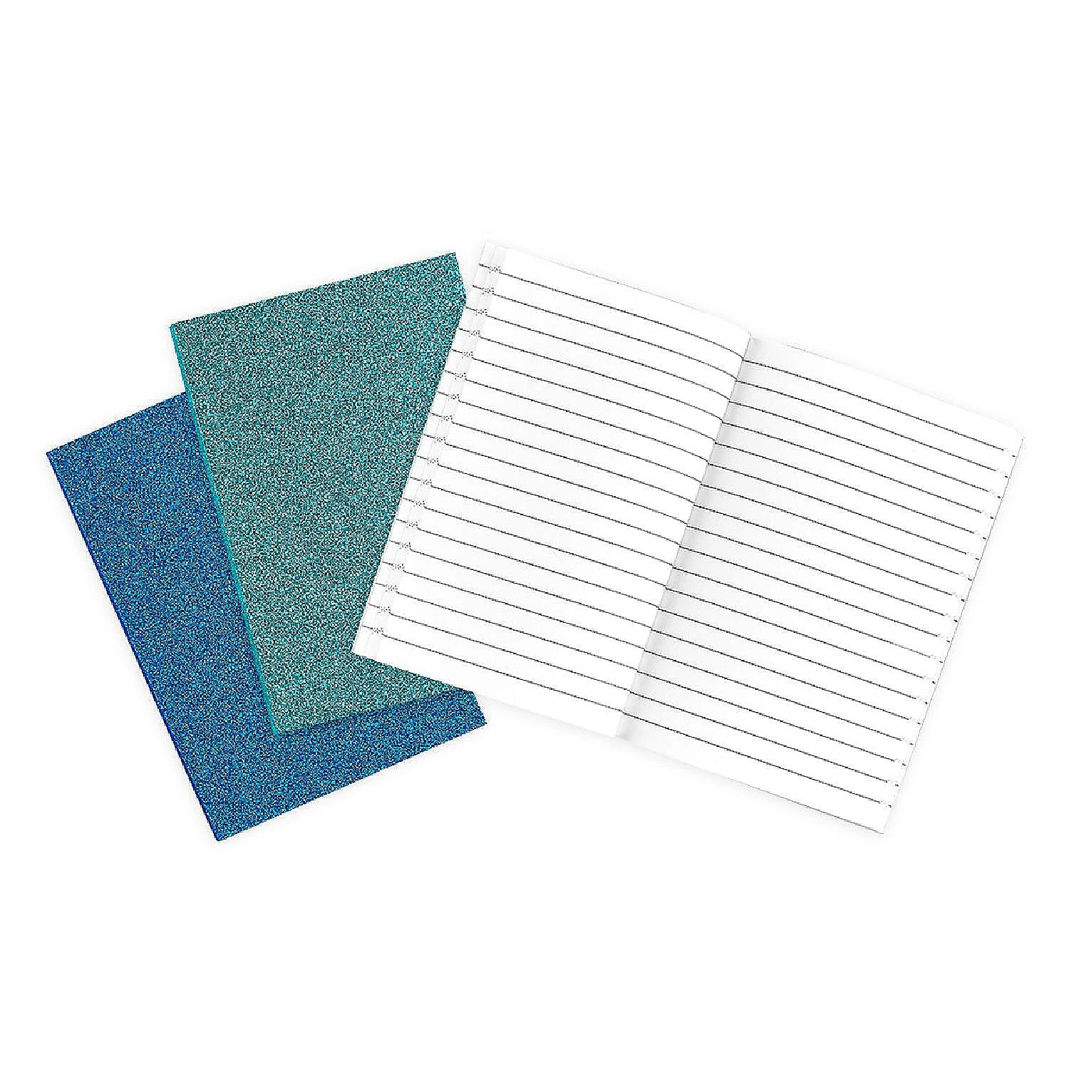 This set of travel sized notebooks is perfect for notetaking and doodling. Go full glam with glitter that does not make a mess. Comes in a set of 3 Notebooks teal, dark blue and light blue Glitter Colors.