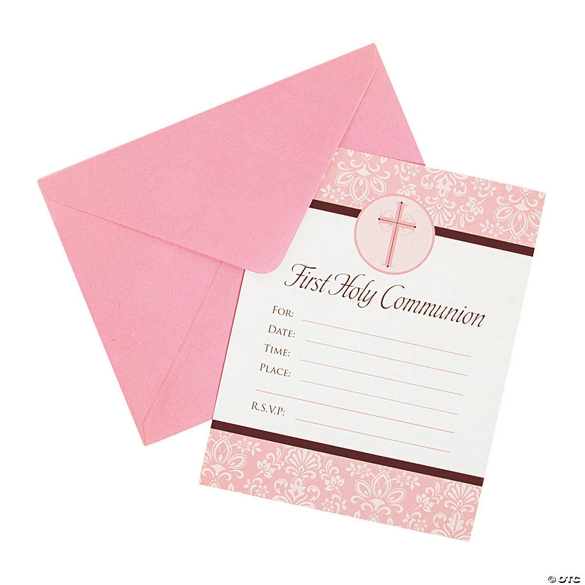 Get the word out about your little one’s special day! A lovely must-have for a girl’s First Holy Communion, these invites feature a design of a pink cross and simple yet sophisticated patterning. Making it easy to include all the details for your celebration, this religious party stationery has spaces to write need-to-know info like date, time and place. Includes envelopes. Paper. (20 pcs. per unit) 7 1/2″