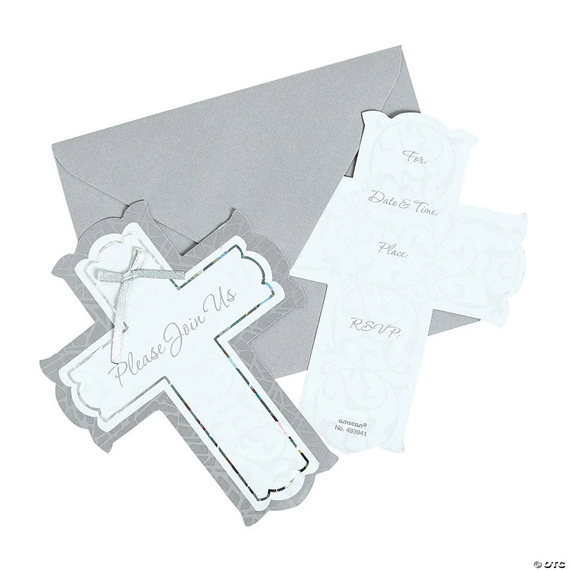 These invitations are simply stunning for your spiritual celebration! A must-have addition to First Communion or Baptism supplies, each one comes designed as a cross with space on the back to write all the event details. Adding style to this party stationery is shimmering, iridescent lining and an elegant bow. Includes envelopes. Paper. (8 pcs. per unit) 10 1/2″