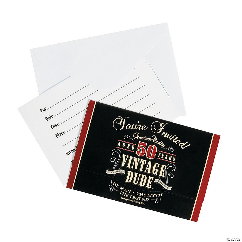 Searching for 50th birthday party ideas? Plan a Vintage Dude party for the man, the myth, the legend! Be sure and pick up our Vintage Dude thank you cards to send after the party! Find all of our Vintage Dude party supplies and decorations throughout our site. Includes 8 each of: invitations and envelopes. Features space for a name, date, time, place, given by and RSVP. Paper. (8 pcs. per unit) 6” x 4”
